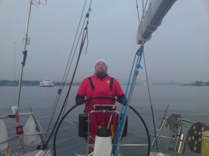 Sesongen er i gang ! Første seiling ble onsdag 7 april i stille vær. Vi så i overkant av 3 knops vind, og logget på det meste nær 4 knop. Bildet viser Thomas på roret i lett tåke.